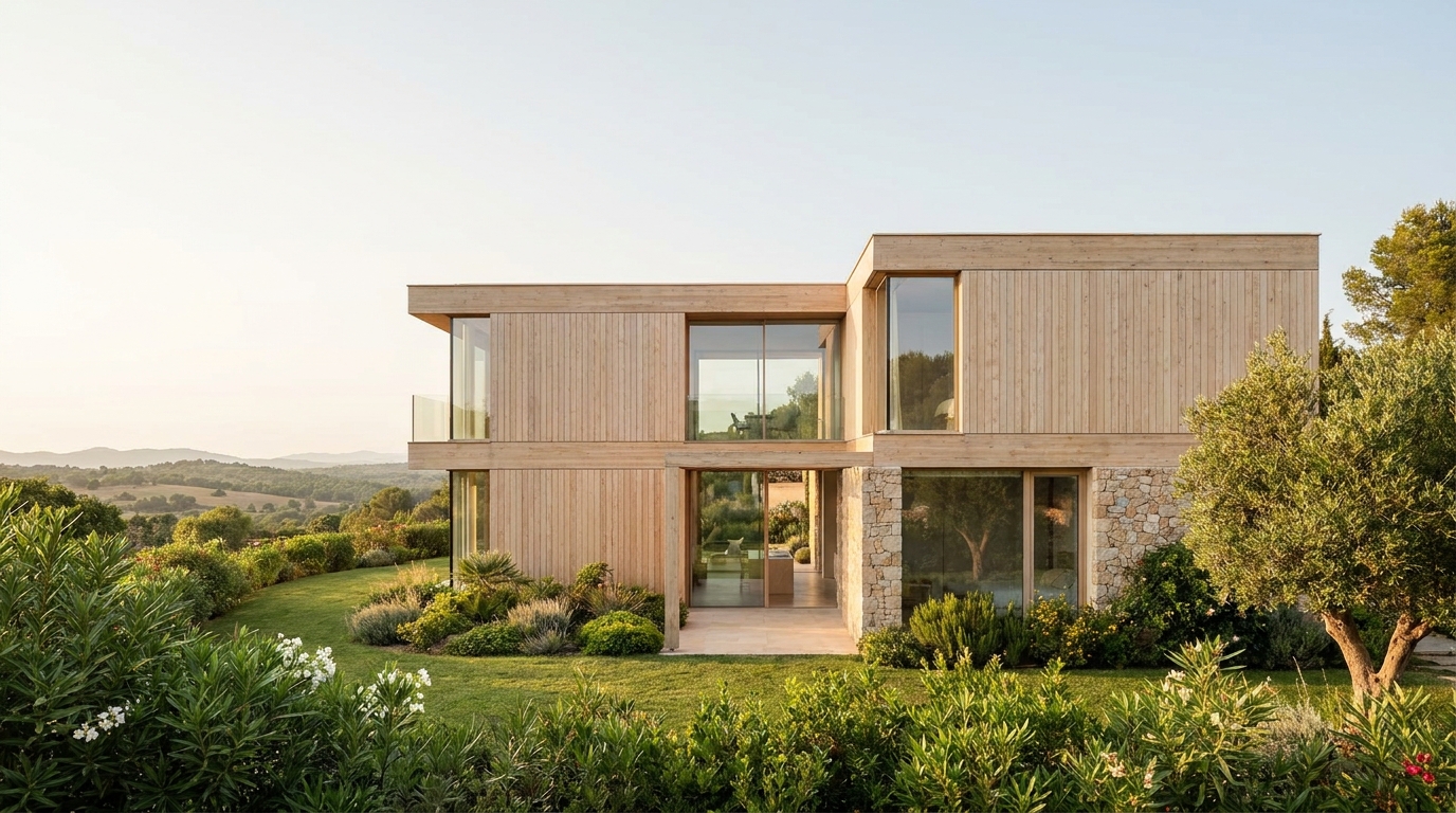 - Project: 140 m2 Mediterranean contemporary modular home, steel frame + timber finishes.
