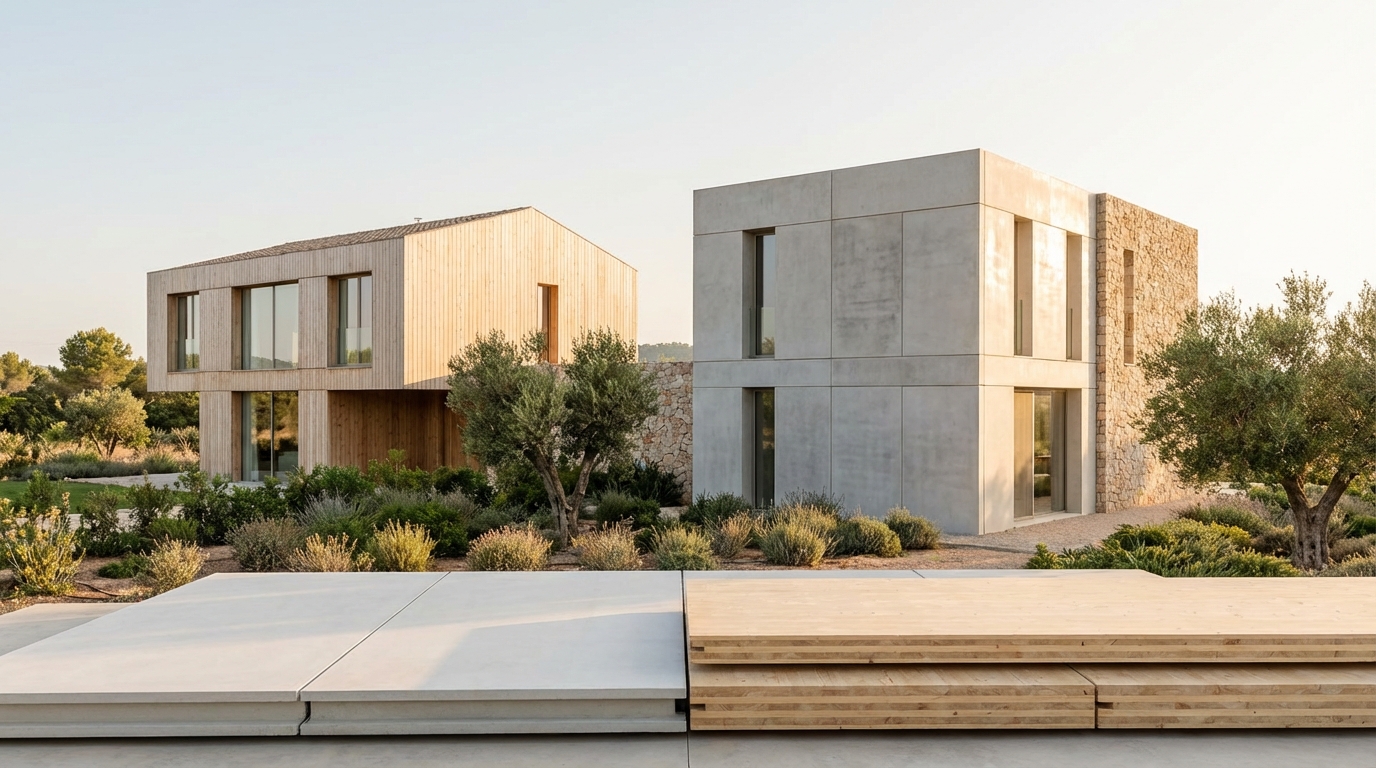 Modern industrialized housing in Spain relies on three main material families: industrialized concrete systems, light timber frame (timber frame) and steel frame. Each offers specific advantages in durability, thermal behavior and construction speed.